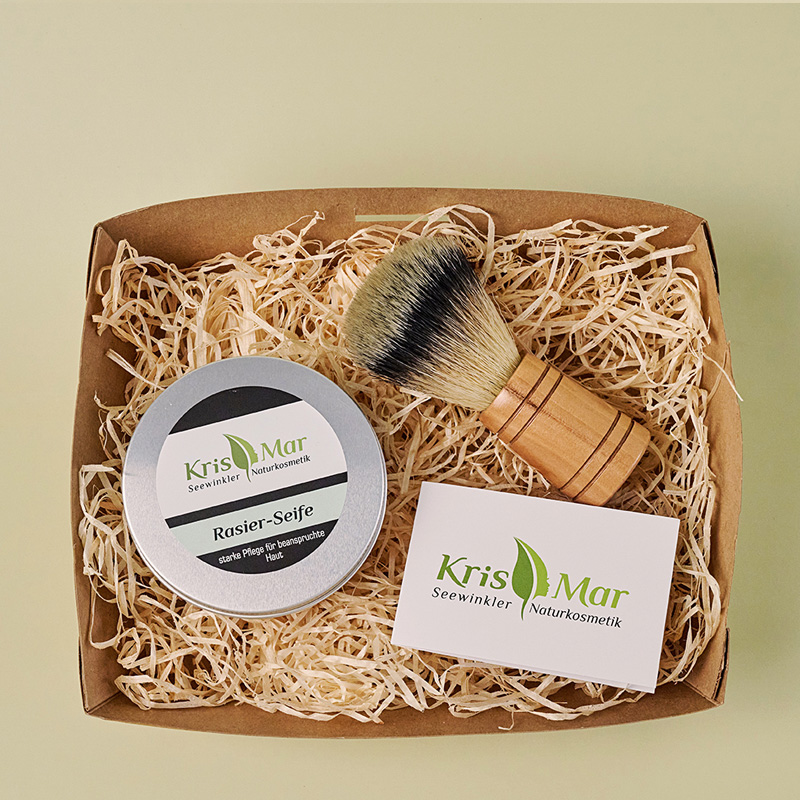 Rasierseife (Männerseife in Aludose) 90g und veganer Rasierpinsel mit Holzgriff verpackt im Naturkarton mit Schleife und Holzwolle.